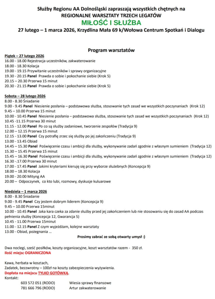 Kolejne Spotkanie Intergrupy AA Piastowska odbędzie się w siedzibie Intergrupy w Lubinie, ul. Jana Pawła II 58, w sobotę dnia 21.02.2026 w wcześniej od godziny 9.00 odbędzie się warsztat w temacie „Pytania i Rekomendacje do 54 Konferencji Służb Krajowych w Polsce ‚’